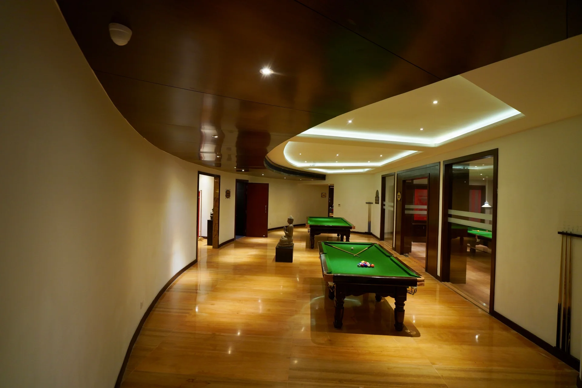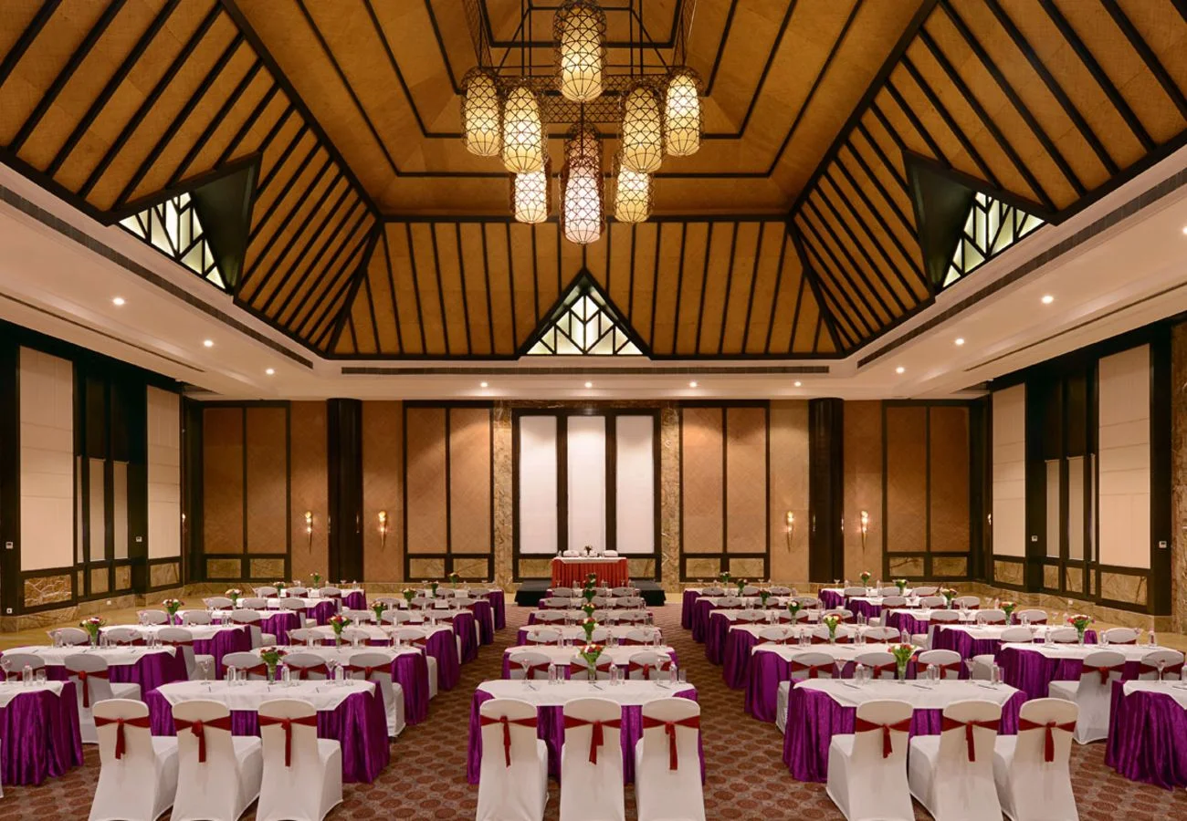 A spacious pillar-less indoor hall with elegant interiors, ideal for indoor functions like cocktails or reception.