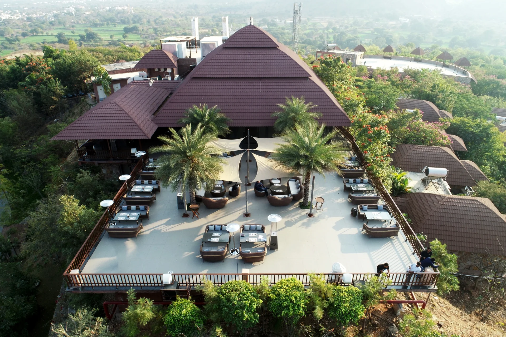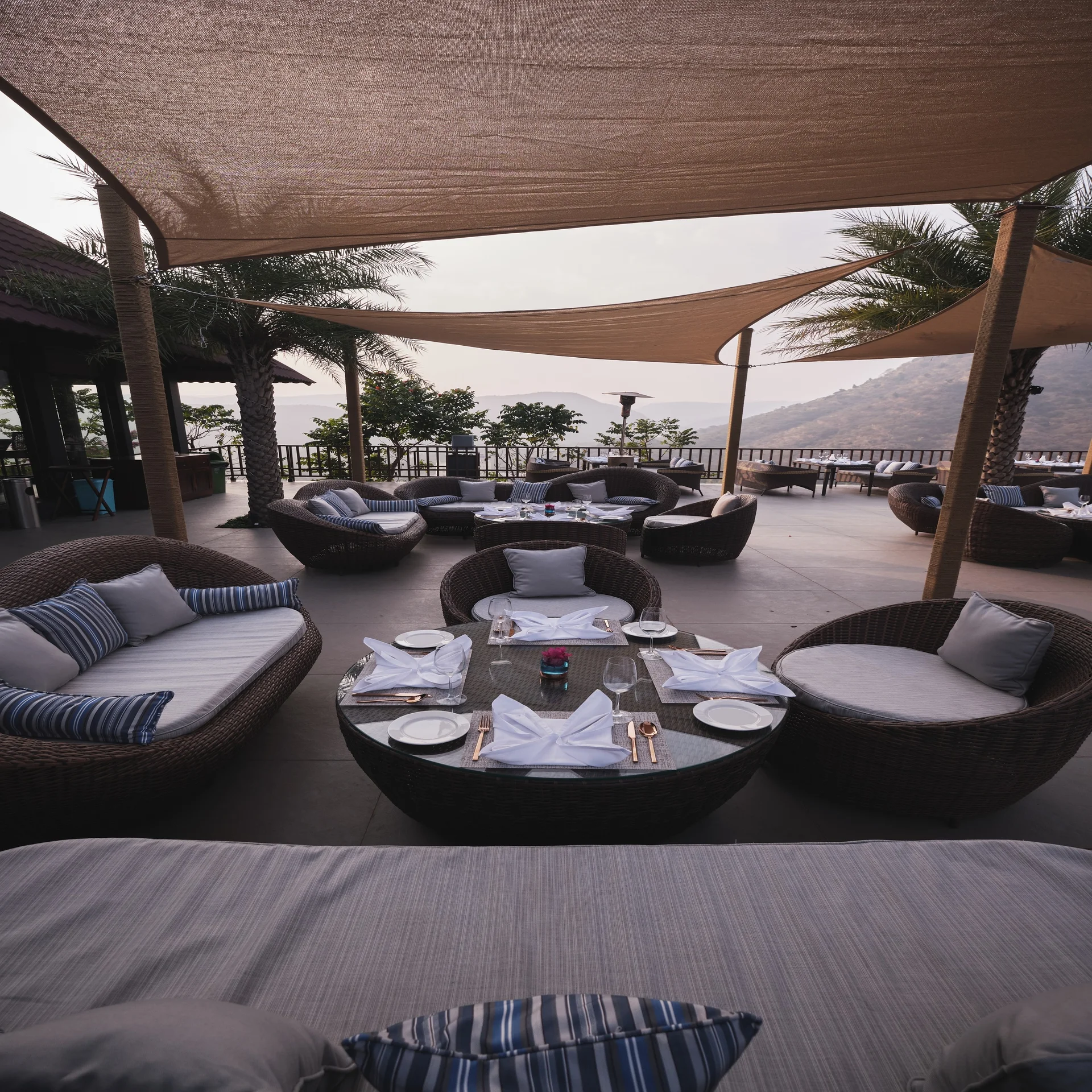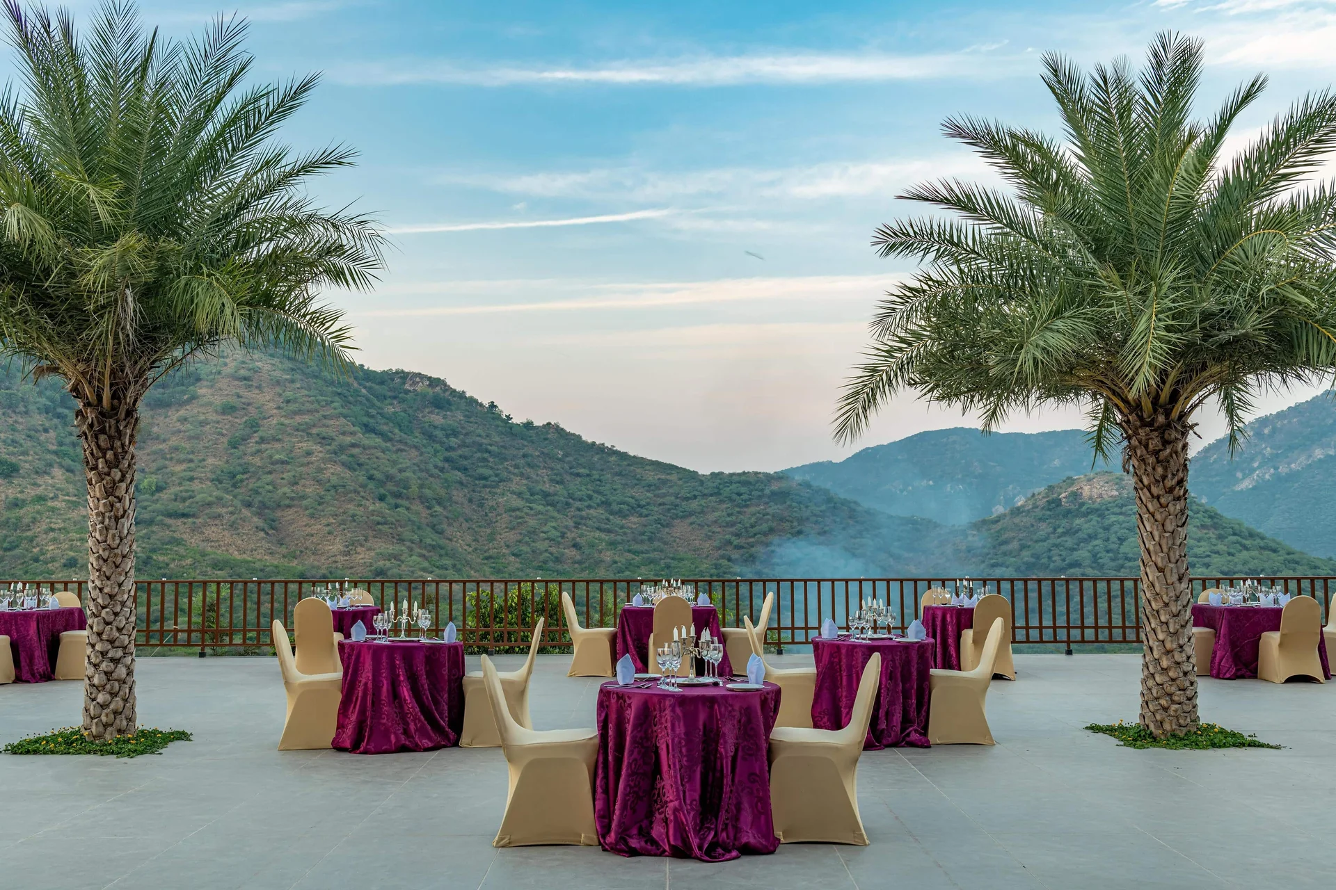 An elevated open-air terrace venue offering stunning panoramic views of the resort and valley, great for Haldi or dinner.