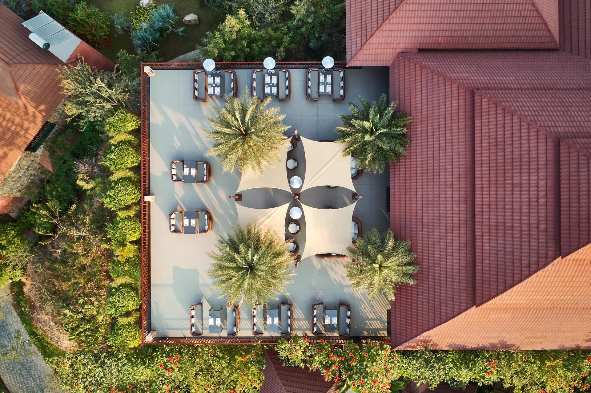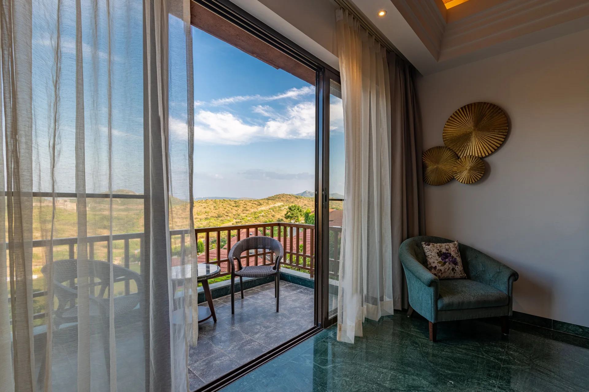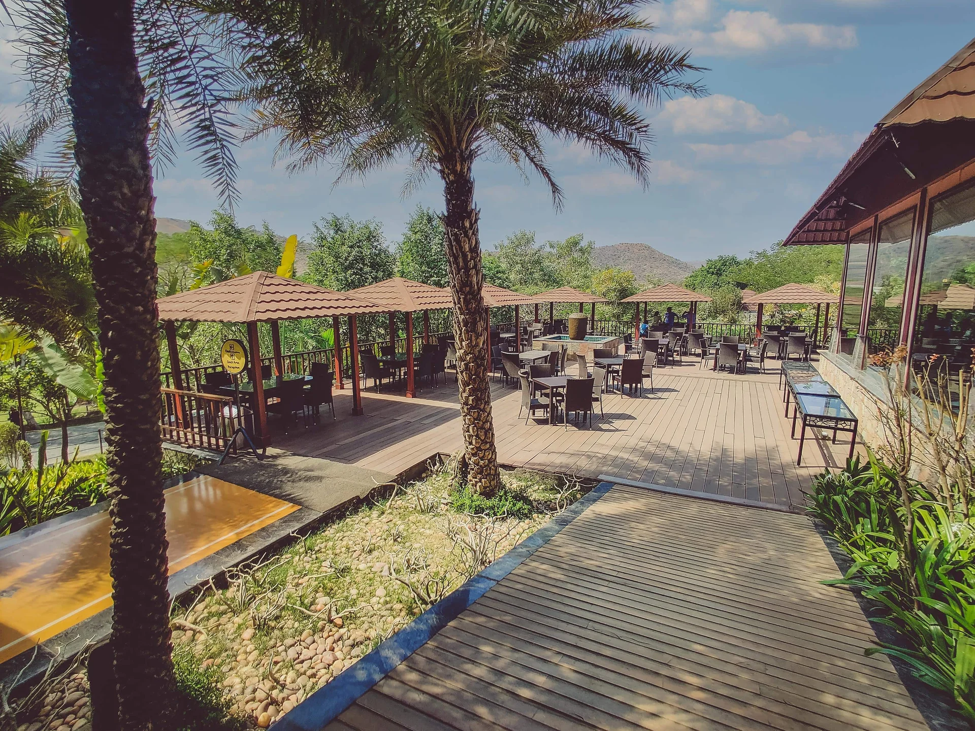 An elevated open-air terrace venue offering stunning panoramic views of the resort and valley, great for Haldi or dinner.