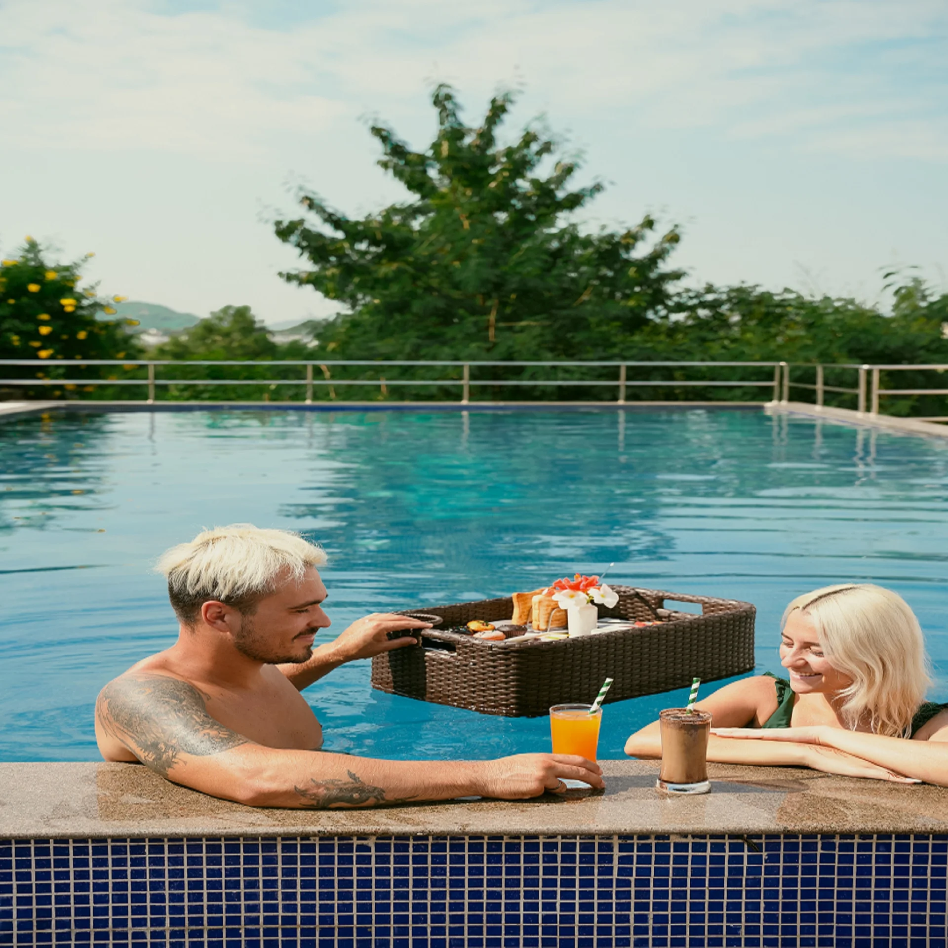A vibrant outdoor setting beside the resort’s two swimming pools, ideal for a fun Haldi or pool party.