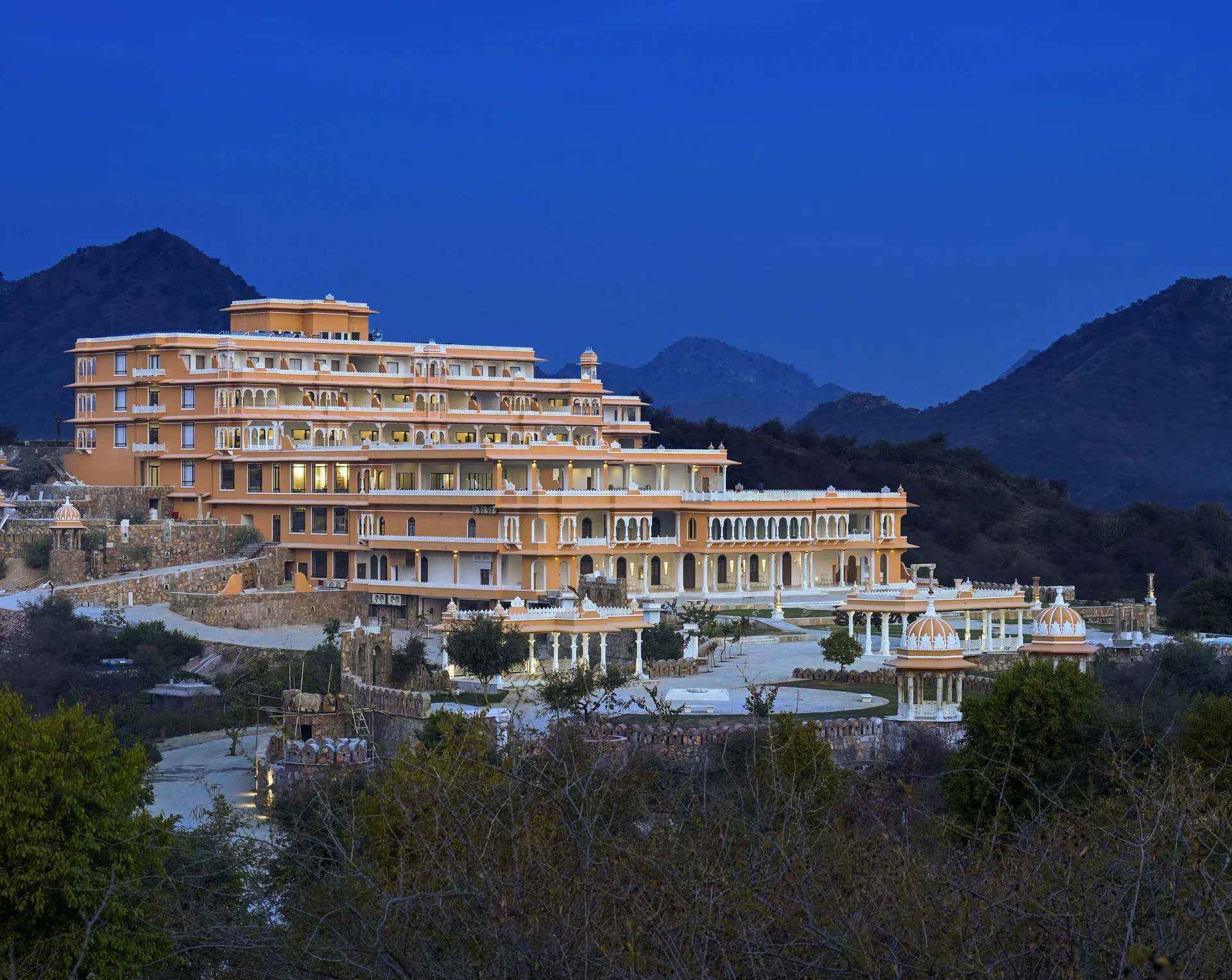 Fateh Vilas is a grand tribute to the architectural heritage of Rajasthan, built with modern sensibilities. Located in the heart of Udaipur near the Celebration Mall area, this hotel stands out with its imposing white façade, grand archways, and intricate stone carvings. While it is a modern construction, it exudes a palace-like charm. It is particularly renowned for having one of the largest rooftop pool venues in the city, offering panoramic views of the Aravalli hills, making it a favorite for cocktail nights and receptions.