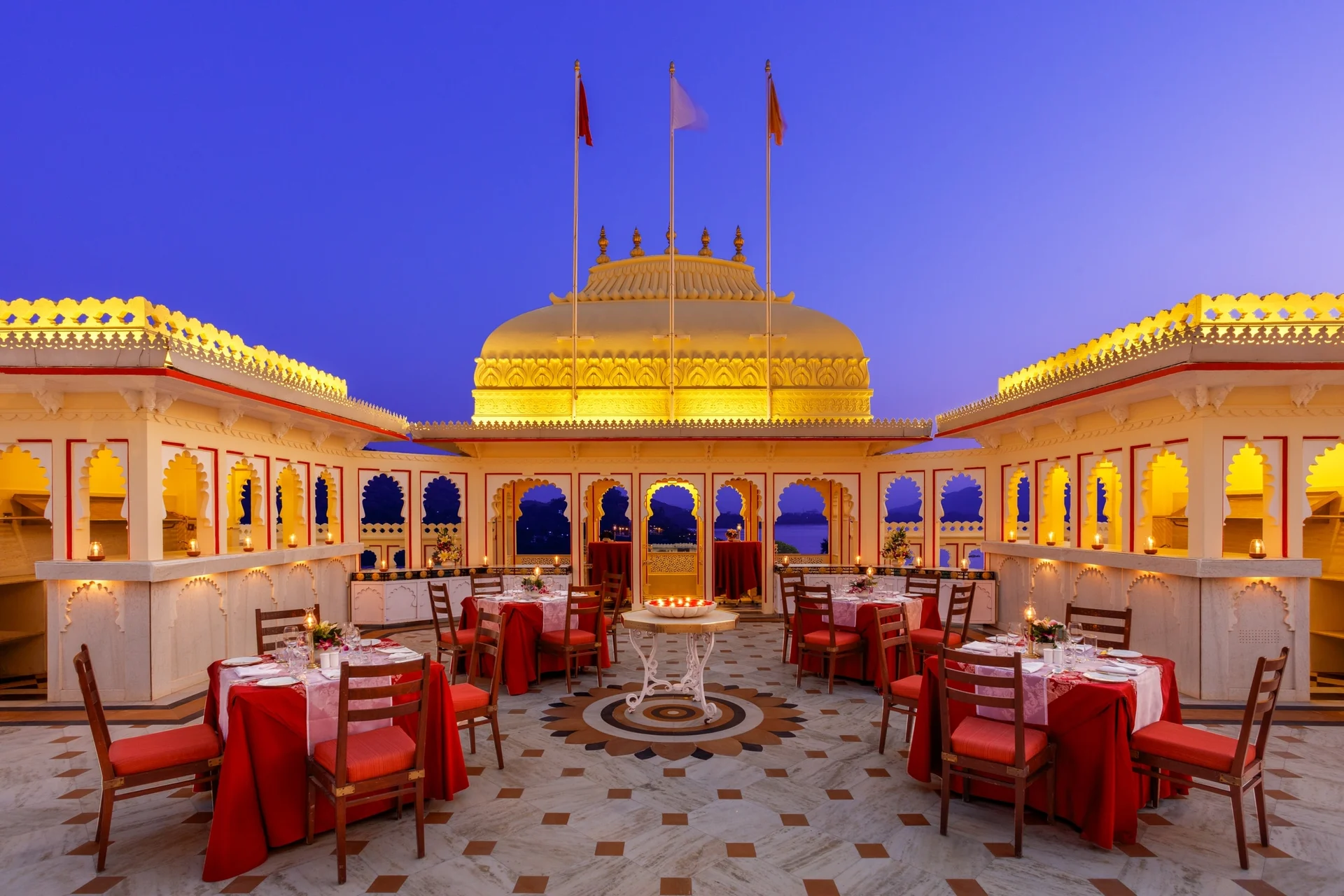 "The crescent-shaped royal guest house within the City Palace, famous for its iconic pool deck and James Bond legacy."