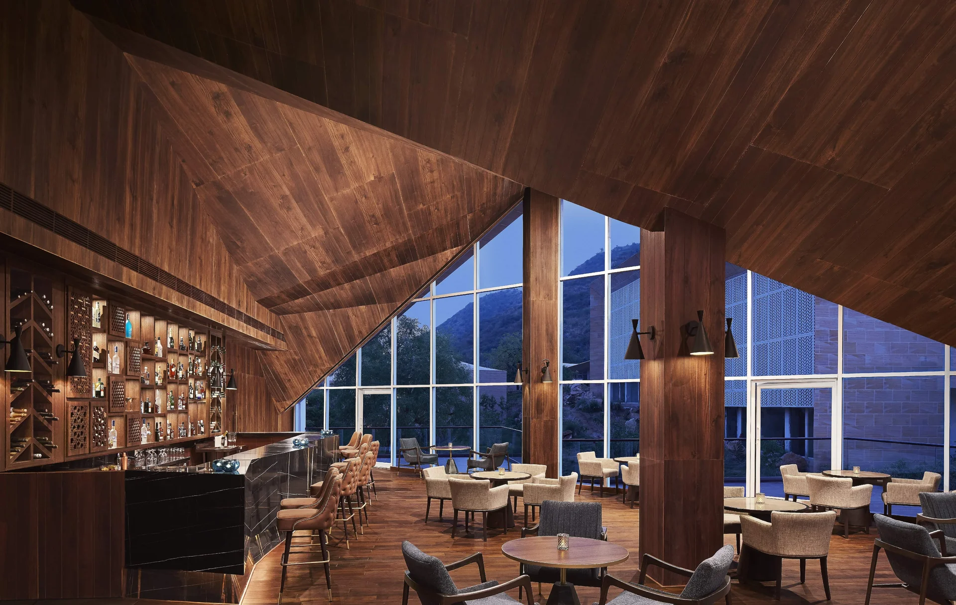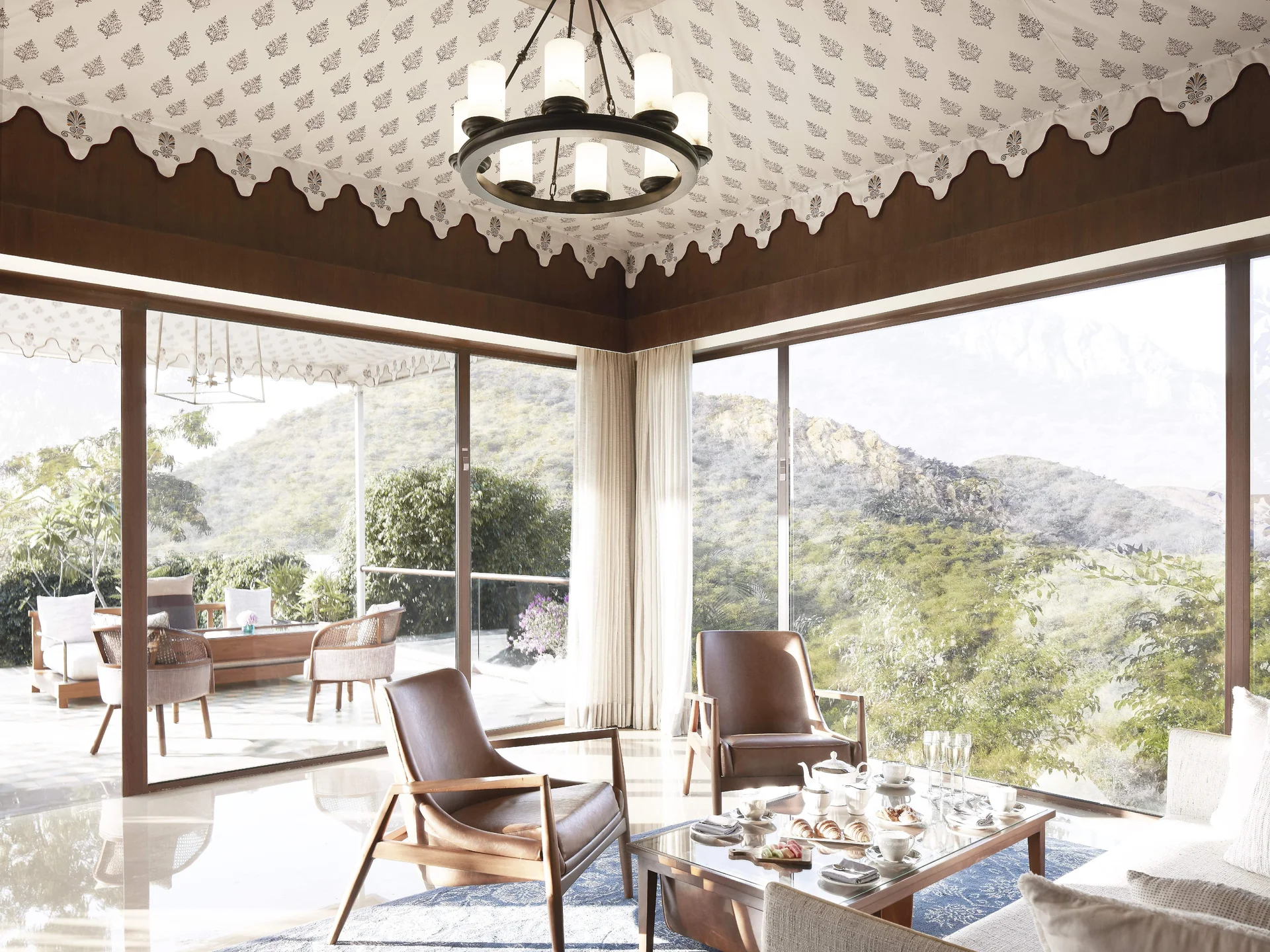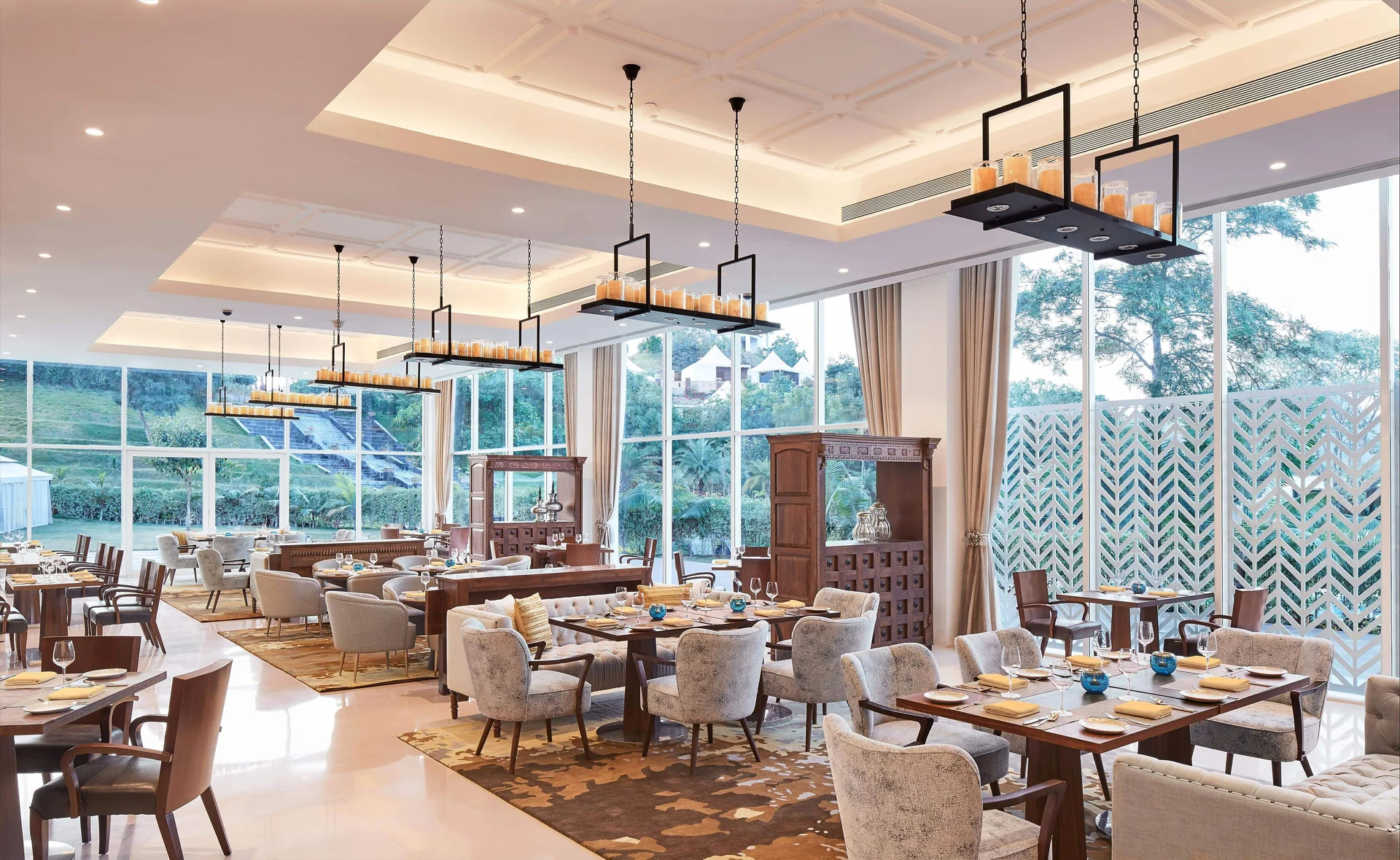 Taj Aravalli Resort & Spa is a modern sanctuary inspired by the dramatic landscape of Rajasthan. Spread across 27 acres at the foothills of the jagged Aravalli mountain range, it feels like a private oasis. The resort is famous for its unique architecture that blends traditional Mewari style with contemporary design, featuring luxury tents that offer a glamping vibe. With one of the largest pillar-less ballrooms in the city and vast manicured lawns, it is a preferred destination for large-scale, lavish destination weddings that require both space and signature Taj hospitality.