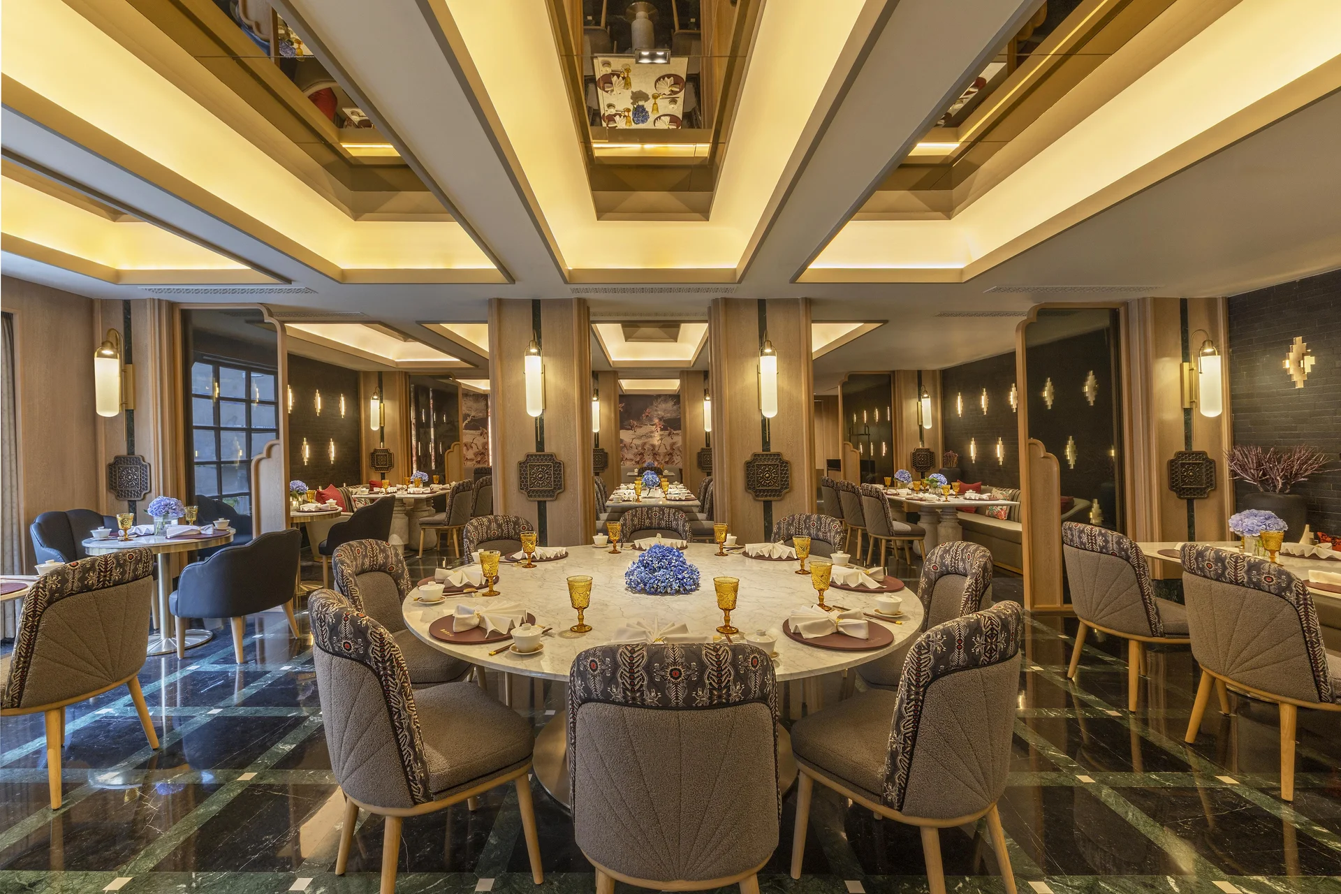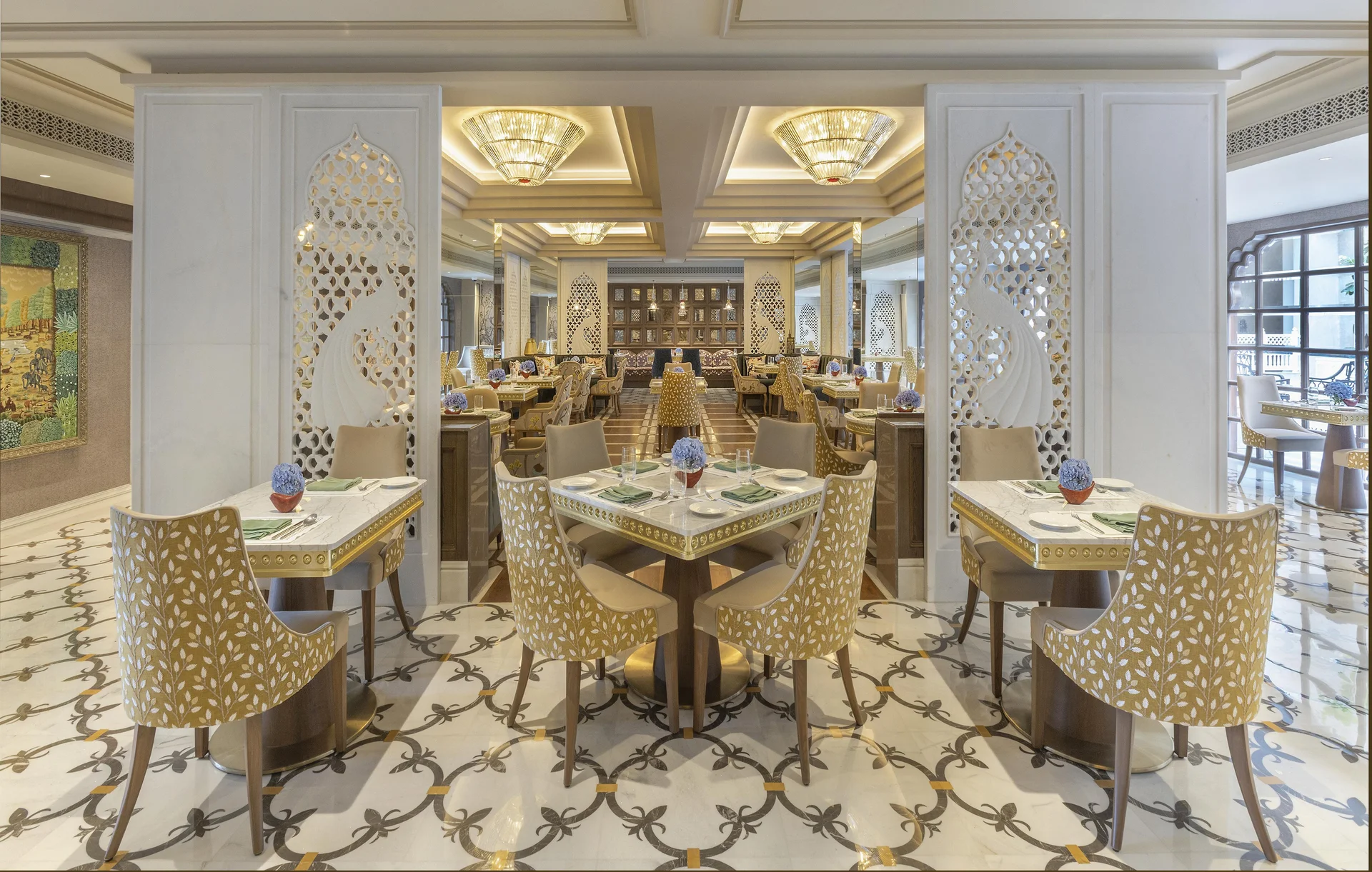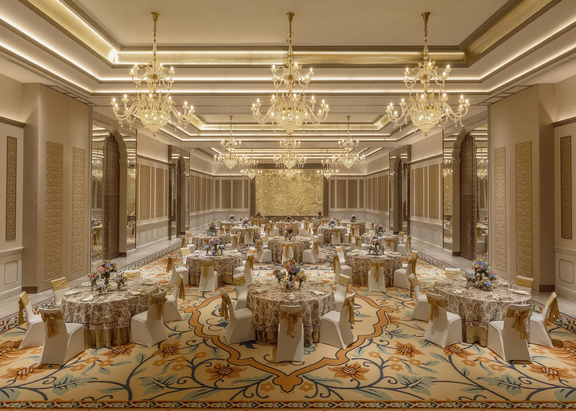 A royal indoor banquet hall featuring heritage architecture and chandeliers, ideal for indoor rituals or dining.