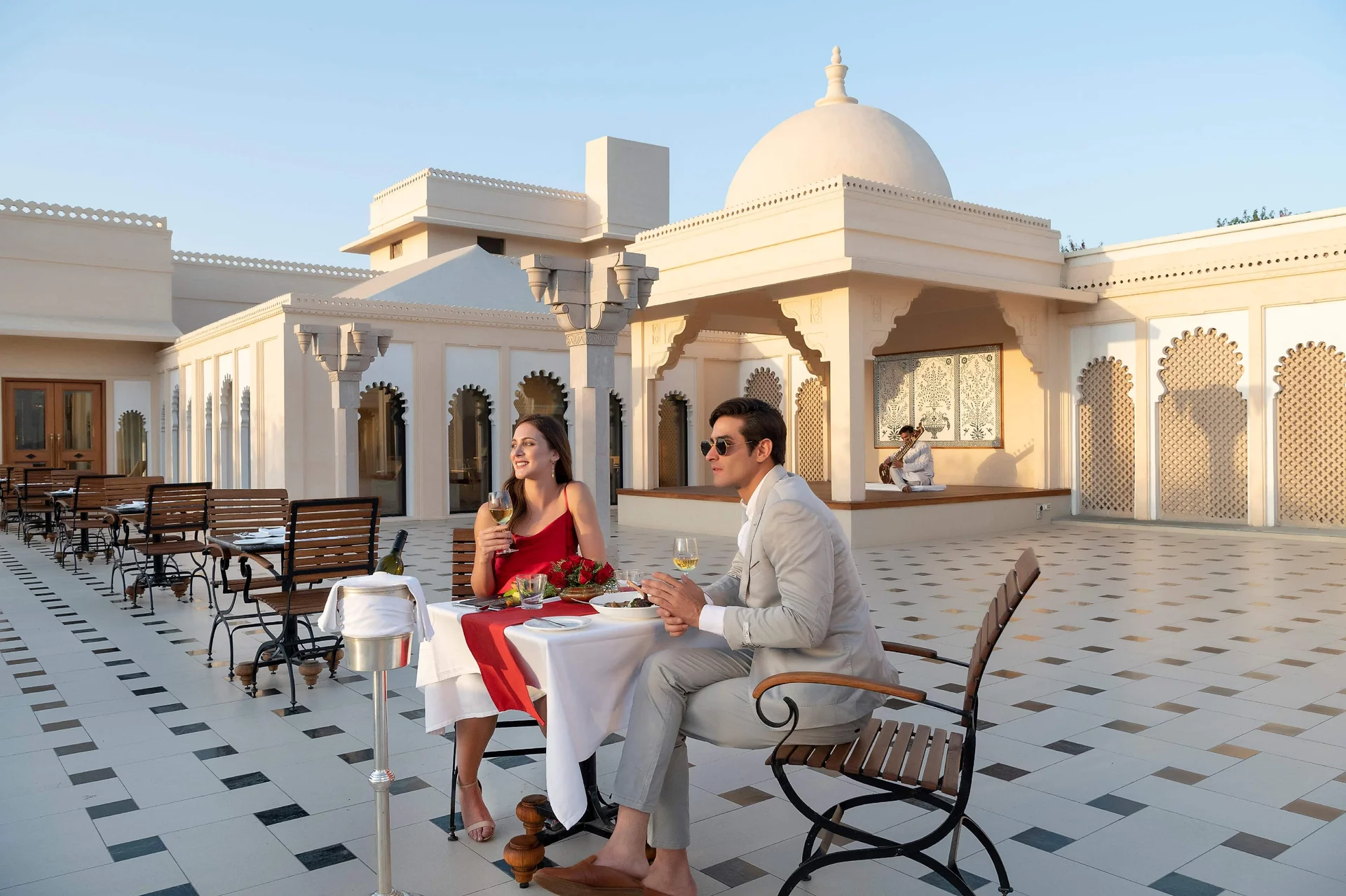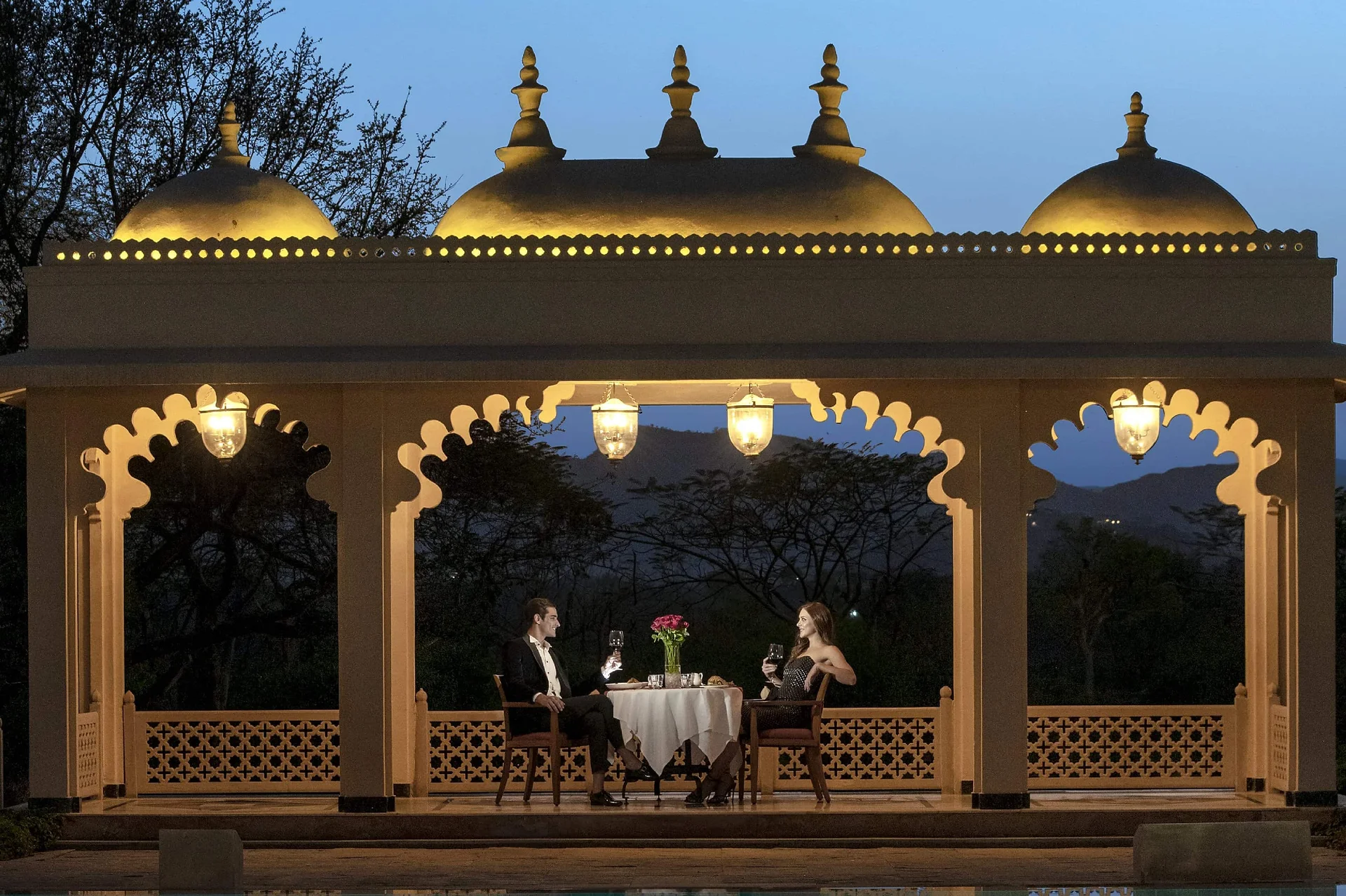 An elevated terrace offering stunning views of the Aravalli mountains and the lake, suitable for cocktail parties.