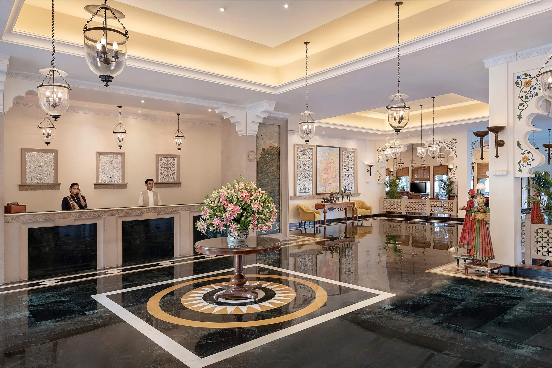 Trident Udaipur is a sanctuary of peace and luxury spread over 43 acres on the banks of Lake Pichola. It shares the same prestigious location as The Oberoi Udaivilas. The resort is built like a traditional Rajasthani fort but is renowned for its lush, sprawling gardens which are actually a 150-year-old wildlife conservancy. It creates a picturesque and earthy setting for weddings, where peacocks roam freely and spotted deer can be seen in the "Bada Mahal" hunting lodge grounds. It offers warm hospitality and a relaxed, nature-centric royal experience.