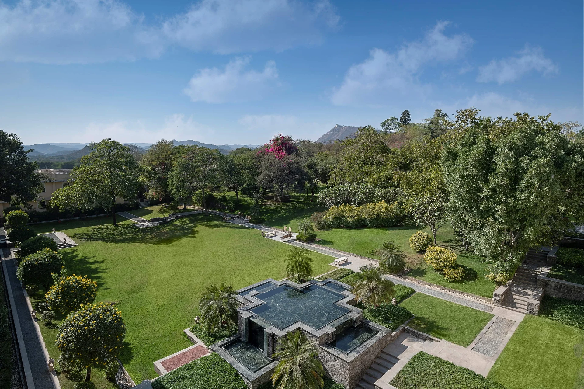 Beautifully manicured gardens facing the hotel’s traditional facade, ideal for a grand reception or Sangeet under the starlit sky.