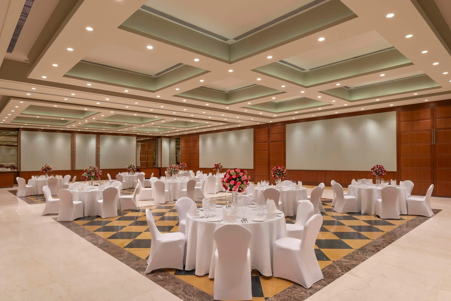 A pillarless indoor banquet hall with modern amenities, perfect for a Sangeet, cocktail party, or indoor rituals.