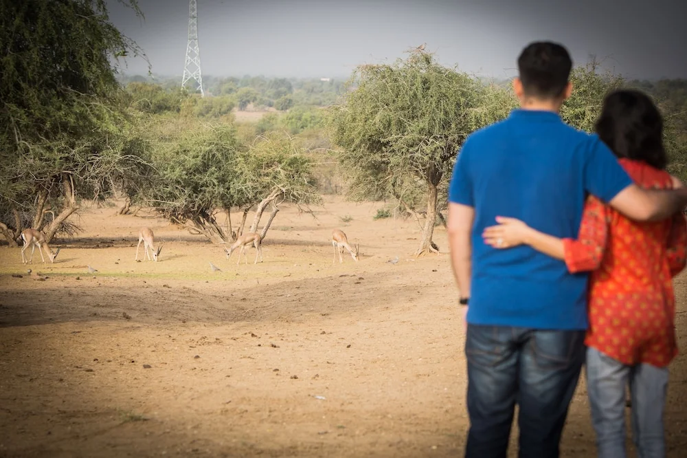 Located in the quiet Uchiyarda area, about 10 km from the airport. The drive sets a peaceful tone, moving away from the city center towards the open desert landscape.