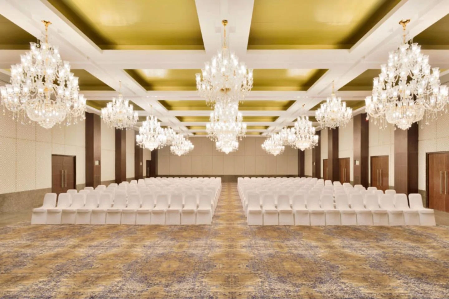 A sophisticated, pillarless indoor venue with modern acoustics and lighting, perfect for a Sangeet or reception.