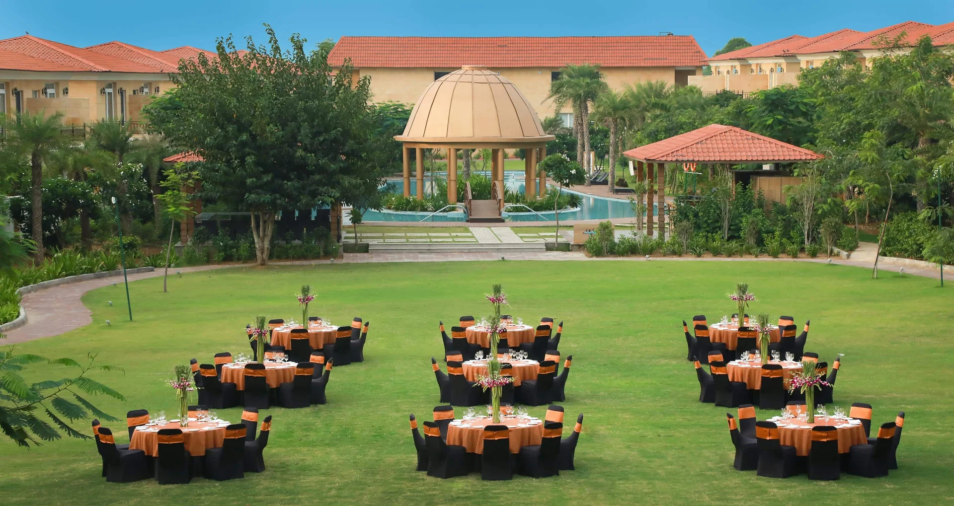 Expansive manicured gardens surrounded by hills, providing a stunning natural canvas for large wedding ceremonies.
